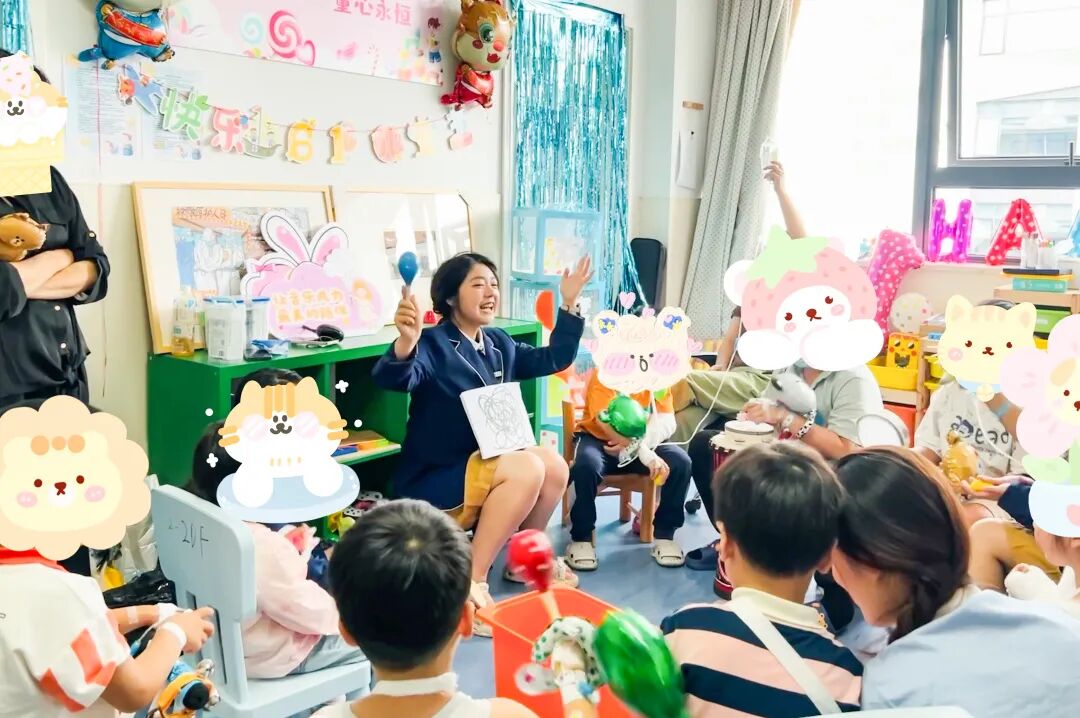 项目团队还在实践中摸索出一套柔性机制。起初,志愿者在游戏室用《幸福拍手歌》引导孤独症儿童互动,却发现孩子们对语言指令毫无反应。团队师生立即调整策略:改为吉他或电子琴演奏,设计“音乐握手舞”,当音乐声停止时,小朋友就要将手中的沙锤传递给旁边的小朋友,或者和他亲切握手,以此锻炼儿童患者之间的社交互动。这种“试错-迭代”的模式,让疗愈方案不断进化。