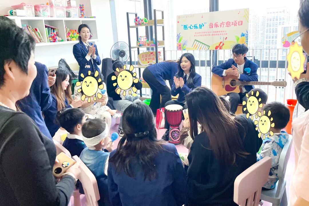 2023年6月,浙大儿院与浙江音乐学院共同启动“医心乐护”音乐疗愈暨“文艺赋美·音乐疗愈角”公益品牌项目。两年来,志愿者每周穿梭于滨江、湖滨两大院区,将音乐化为“处方”,注入不同科室:医院大厅的钢琴演奏缓解焦虑,病房游戏室内的音乐游戏帮助孩子忘记病痛,孤独症门诊通过社交训练来提升语言和情绪表达能力。