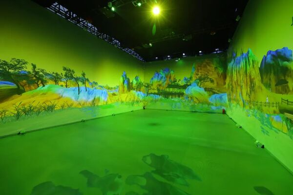《光影丹青》沉浸式展厅吸引了博览会现场观众的热情关注和参与体验。该项目在“盛世修典—中国历代绘画大系”成果展基础上,以虚拟现实引擎驱动空间投影技术,采用全新的空间音频智能处理技术和视、听、触多感官实时交互装置,融古琴、笛、箫、琵琶等传统民族器乐音色与FM合成、粒子合成及采样等声音合成技术所形成的电子音色于一体,实现传统音乐元素与现代音乐元素有机融合,从而塑造出“似实而虚、似虚还实”“声景交互、情景交互”的音乐意境,让古画在声、光、影中“活起来”,营造了一个个生动的画中世界,让观众在沉浸式画境空间,欣赏从历史中“走出来”的中国历代绘画。