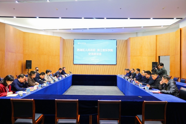 干武东、王瑞对周扬一行来校调研表示欢迎,对西湖区一直以来对学院办学的支持表示感谢,并分别介绍了浙江音乐学院近年来的发展建设情况。周扬对学院发展取得的成绩表示赞赏,并就区校合作提出了意见。双方一致认为,要充分发挥各自优势,在人才培养、艺术品牌打造、产学研协作等方面开展务实合作,通过优势联动,实现校地共赢发展。