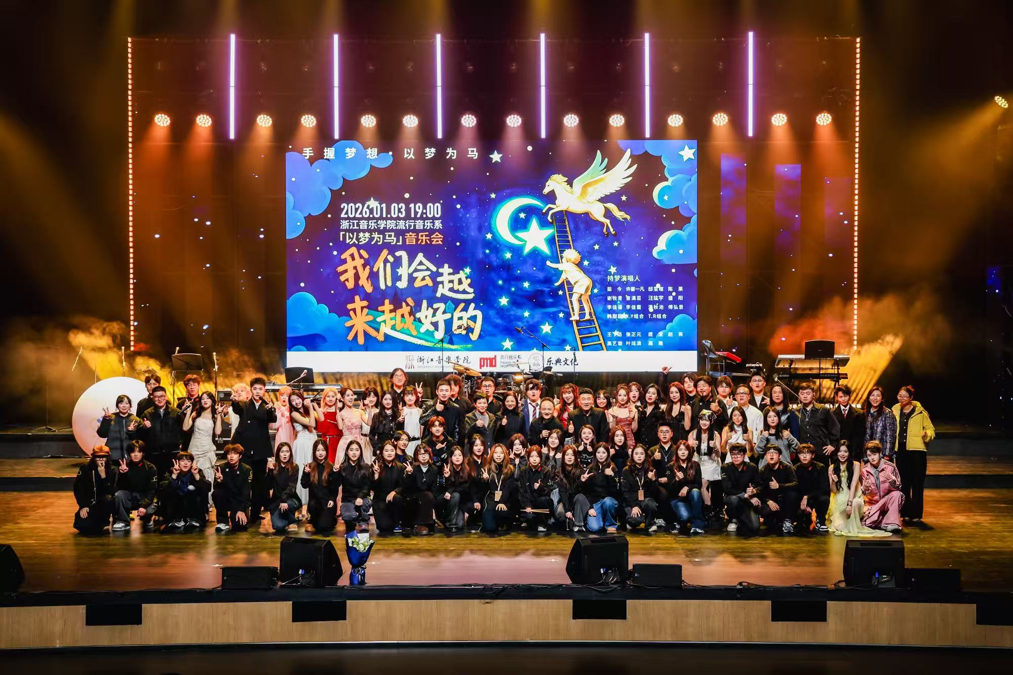 流行音乐系新年音乐会自2016年举办以来,迄今已是第9届。今年音乐会以“手握梦想,以梦为马”为主题,核心亮点在于“师生同台”的创新形式。这不仅是舞台呈现的一次突破,更是教学理念的生动实践——教师不再仅是台下的指导者,更是台上的示范者与并肩作战的伙伴。这种言传身教、携手演出的模式,极大提升了学生的表现力,在实践中传递了宝贵的舞台经验与艺术精神。