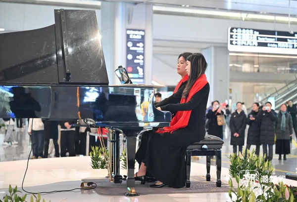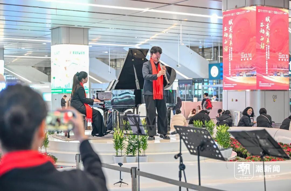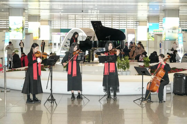 演出在《保卫黄河》的激昂旋律中拉开序幕,四手联弹铿锵有力,钢琴的厚重音色与明快节奏交织碰撞,瞬间点燃现场热烈气氛。紧接着,弦乐四重奏《拉德斯基进行曲》奏响明快的新年节拍,欢快的旋律流淌在候车大厅的每个角落,让喜庆氛围四处洋溢;钢琴与弦乐四重奏演绎的《梁祝》婉转缠绵,经典旋律跨越岁月长河,将东方独有的浪漫与深情娓娓道来;钢琴与单簧管合作的《单簧管波尔卡》灵动俏皮,乐器间的默契配合引得现场掌声阵阵、喝彩连连。