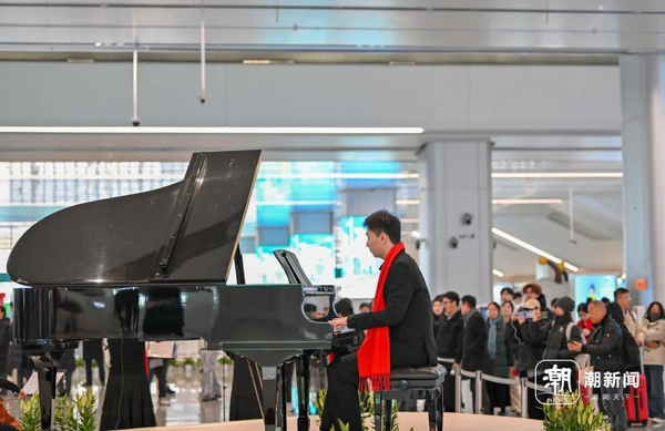 独奏曲目同样精彩纷呈,《彩云追月》意境悠远,声声琴音勾勒出江南夜色的朦胧唯美;《茉莉花》清新雅致,熟悉的旋律唤起全场共鸣,余韵悠长。当《歌唱祖国》的激昂曲调响起,钢琴与弦乐四重奏的完美融合,将炽热的家国情怀融入每一个跳动的音符;钢琴和弦乐四重奏共同演绎的《我和我的祖国》《我爱你中国》,更是以满腔爱国热情点燃整个大厅。在旅客们热烈的掌声和欢呼声中,《我和我的祖国》的旋律再次响起,现场群众自发加入合唱,激昂的琴声与嘹亮的歌声交织共振,汇聚成一片炽热的爱国热潮,演出也在万众同心的动人旋律中圆满落幕。