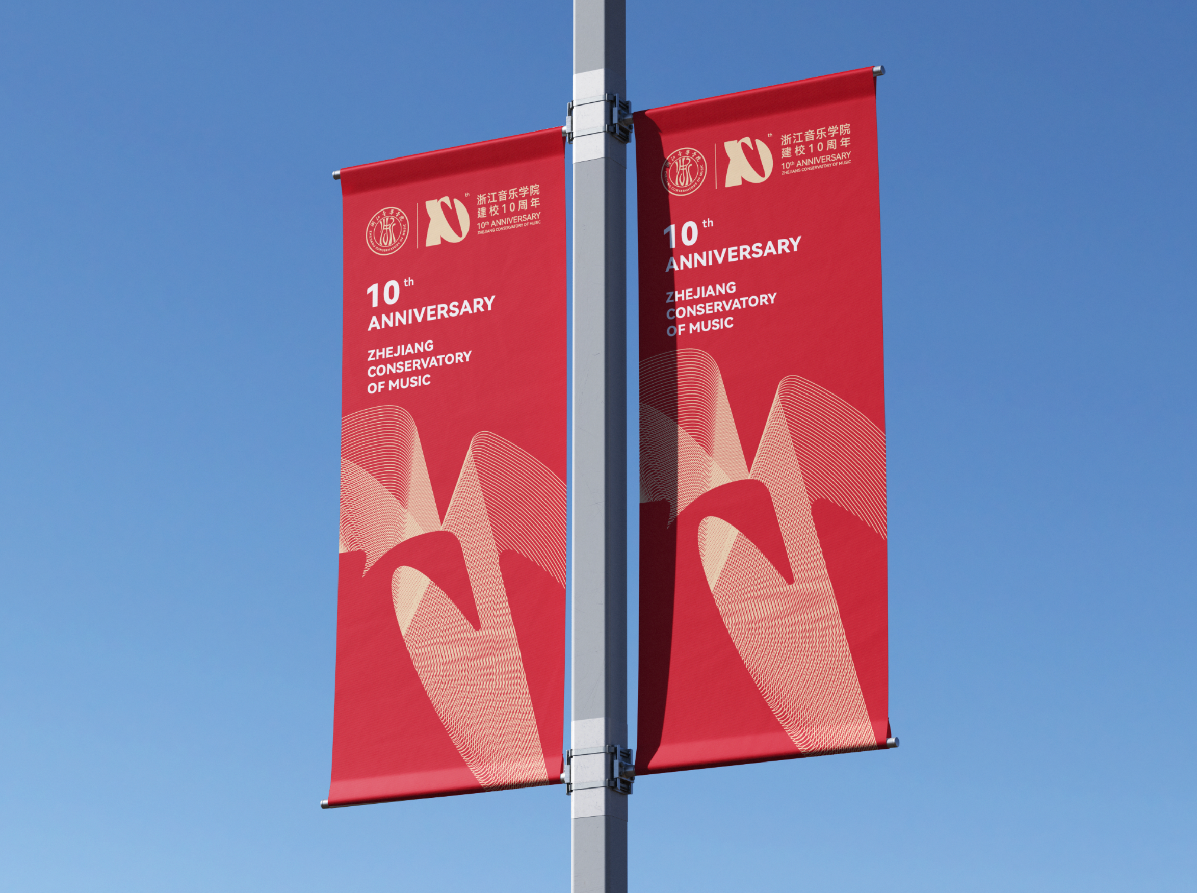 浙江音乐学院10周年校庆标识,以“弦歌十载,尽善致远” 为核心设计理念,将具象符号与数字“10”创意同构,形成独具韵味的视觉形象。